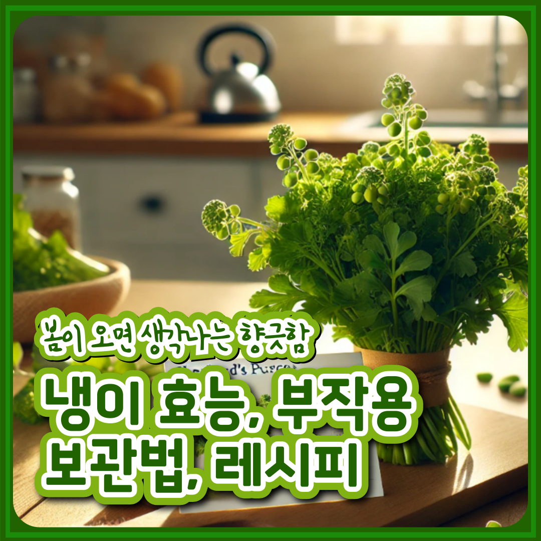 봄철 대표 나물, 냉이의 모든 것!봄봄봄~ 봄이 왔네요~ 얼마전, 겨울잠을 자던 개구리가 깨어나는 경칩이었다는 사실 알고 계신가요? 봄이 오면 가장 먼저 떠오르는 나물 중 하나가 냉이입니다. 쌉싸름하면서도 향긋한 맛 덕분에 된장국, 무침, 전 등 다양한 요리에 활용되죠. 하지만 냉이는 단순한 나물이 아닙니다. 비타민과 미네랄이 풍부해 건강에 도움을 주는 식재료로도 잘 알려져 있어요. 이번 포스팅에서는 냉이의 효능, 부작용, 손질법, 보관법, 그리고 맛있게 먹는 방법까지 모두 정리해 드릴게요. 냉이를 제대로 알고, 건강하게 섭취하는 방법을 알아봅시다! 🌱냉이의 효능 💚냉이는 봄철 보약이라고도 불릴 만큼 다양한 영양소를 함유하고 있습니다. 대표적인 효능을 살펴볼까요?✅ 1) 간 건강 보호냉이에는 베타카로..